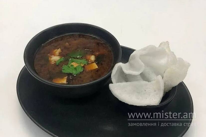 Місо бульйон, рисова локшина, креветка, сир тофу, водорості вакаме, цибуля зелена, кінза, рисові чипси.