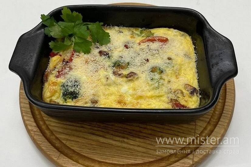 Запечений омлет з двох яєць, з беконом, перцем болгарським, броколі, кабачком, печерицями, помідором чері, вершками, моцарелою та пармезаном.