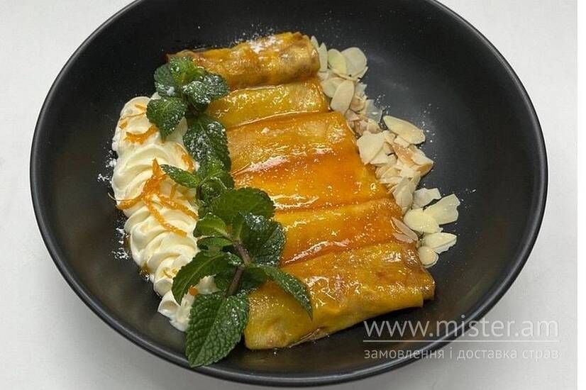 Млинці карамелізовані в апельсиновому соусі, з вершково-сирним кремом та мигдалевими пластівцями.