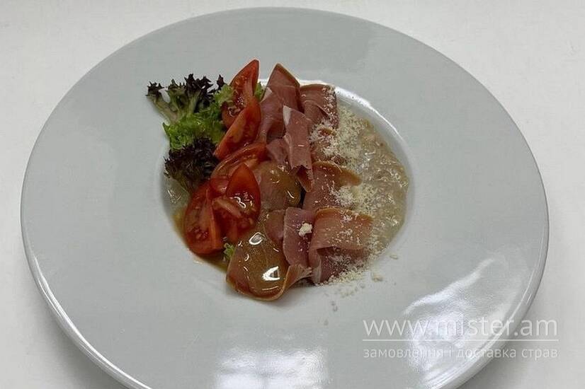 Пластівці вівсяні, масло вершкове, листя салату, прошуто, помідор чері, пармезан, гірчично-медовий соус.