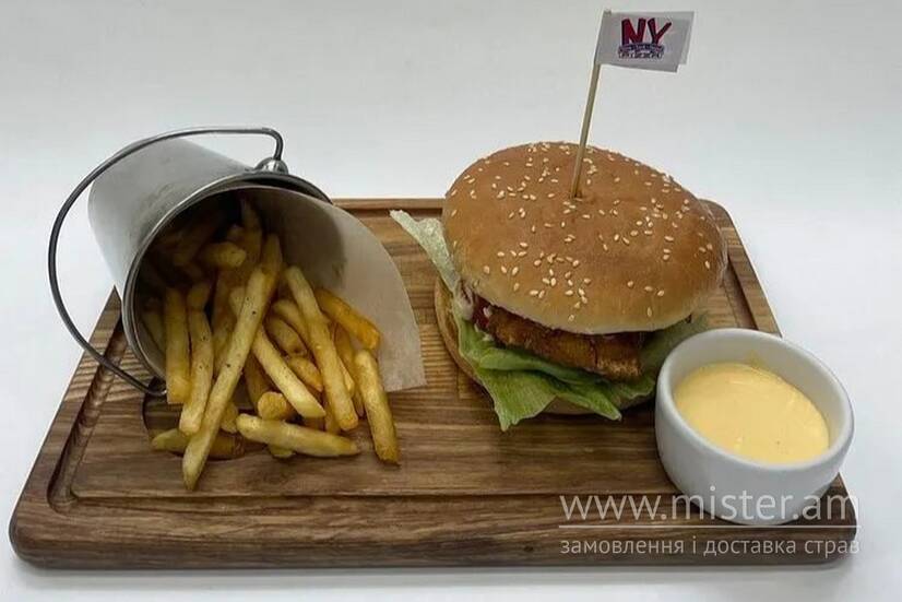Ніжне куряче філе з бедра зі свіжим помідором, листям салату, соленим огірком, медово-гірчичним соусом у булочці з кунжутом, фрі та соусом сирним.