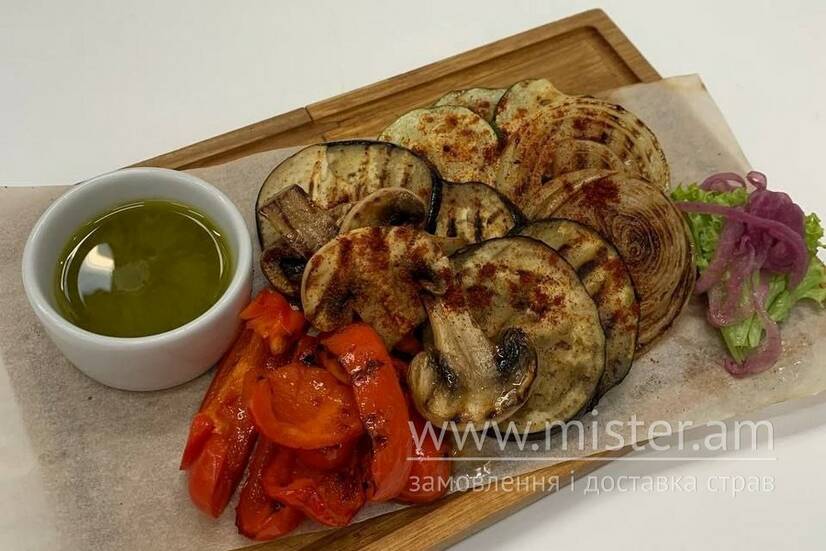 Цибуля ріпчаста, перець болгарський, печериці свіжі, кабачок, баклажан, соус песто.