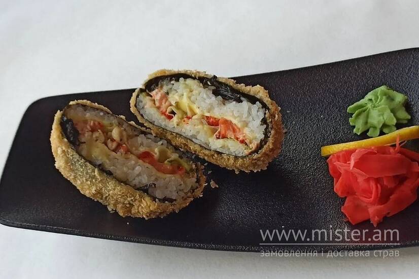 Рис для суші, норі, ікра корюшки, листя салату, сир тостовий, лосось, сир для суші, сухарі панко.