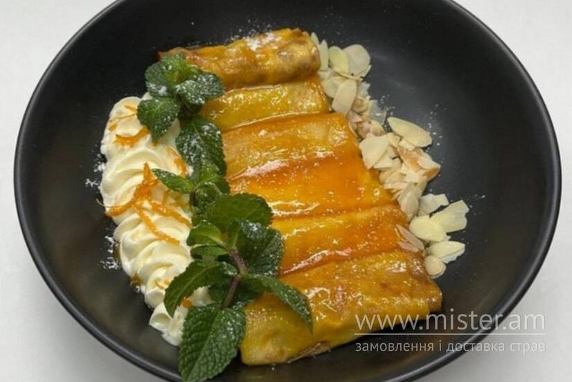 Млинці карамелізовані в апельсиновому соусі, з вершково-сирним кремом та мигдалевими пластівцями.