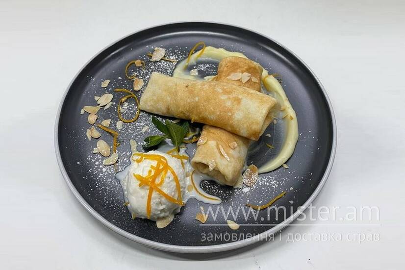 Яблука пасеровані, морозиво, крем заварний, мигдальні пластівці, цедра апельсина, м'ята.