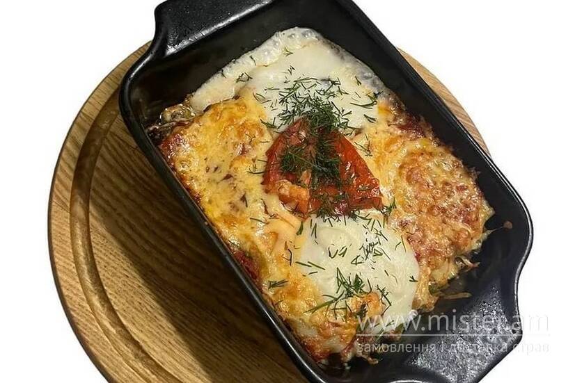 Листи макаронного тіста, фірмовий соус, куряче філе, сир, крем-сир, помідор, соус бешамель.