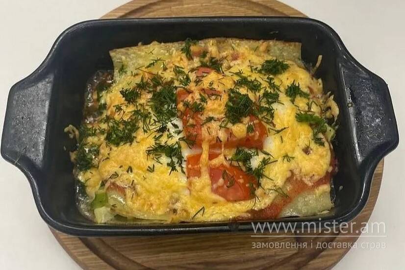 Листи макаронного тіста, соус томатний кабачок, помідор, броколі, перець болгарський, сир твердий, соус бешамель.