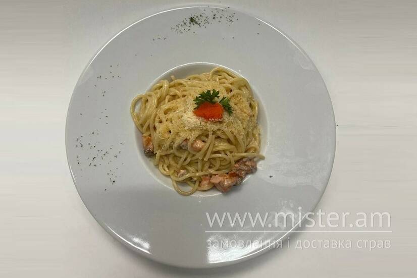 Спагеті, вершки, сир пармезан, ікра масаго, лосось філе, зелень.