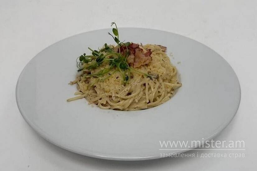 Спагеті, вершки, бекон, печериці, крем трюфельний, пармезан.