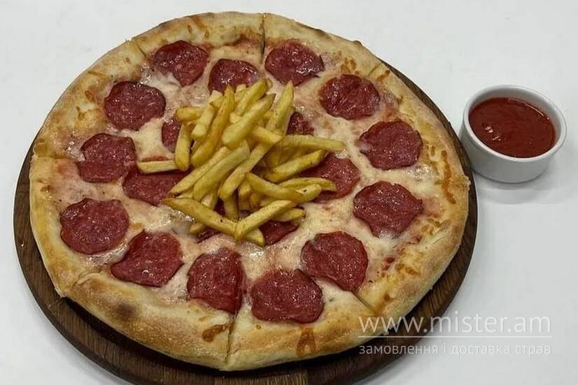 Тісто, соус фірмовий, сир моцарела, салямі, картопля фрі, соус барбекю.