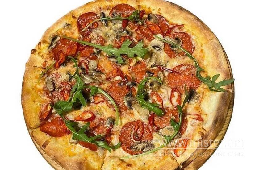 Тісто, фірмовий соус, моцарела, печериці, салямі пепероні, пармезан, перець чилі, рукола.