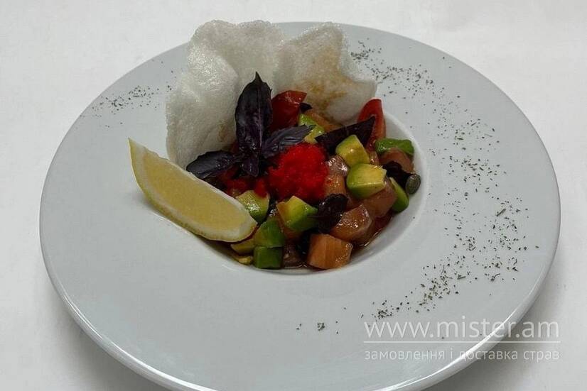 Легкий та вишуканий салат, що поєднує ніжний лосось, стиглий авокадо, соковиті томати чері та пікантні каперси. Свіже листя базиліку додає аромату, а ікра корюшки надає страві морського шарму та витонченості. Заправляємо фірмовим соусом.