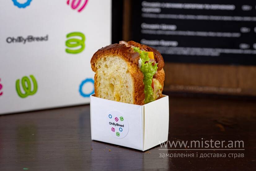 Хліб бріош, ковбаса салямі, сир чеддер, помідор, огірок, салат, соус цезар, соус вітело тонато.