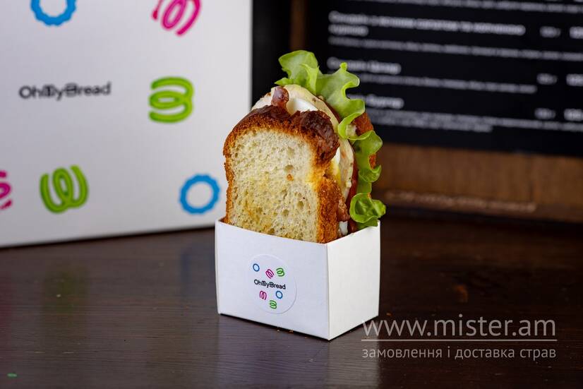 Хліб бріош, філе курячого стегна, бекон, помідор, яйце, соус цезар, салат.