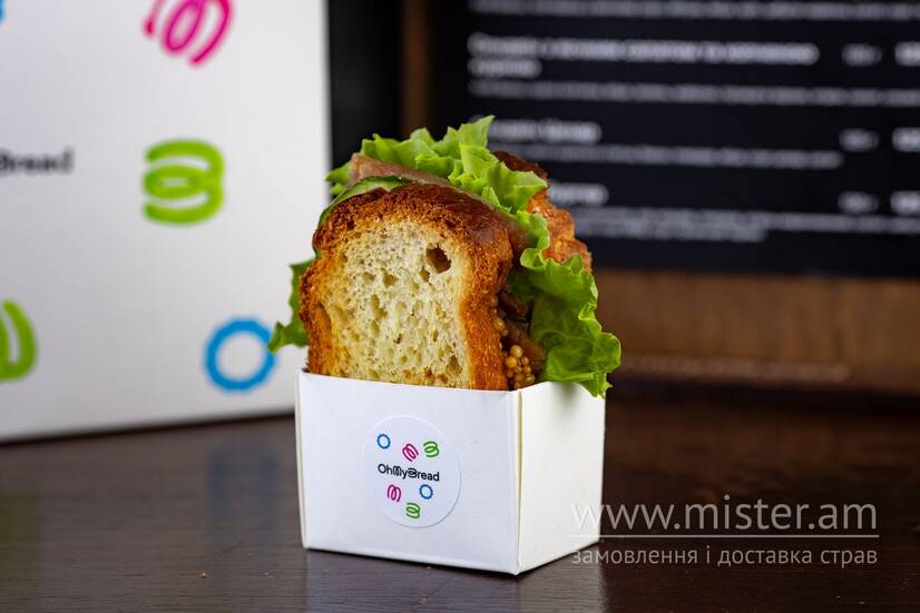Хліб бріош, копчений тунець, крем сир, копчений сир, огірок, гірчиця в зернах, салат.
