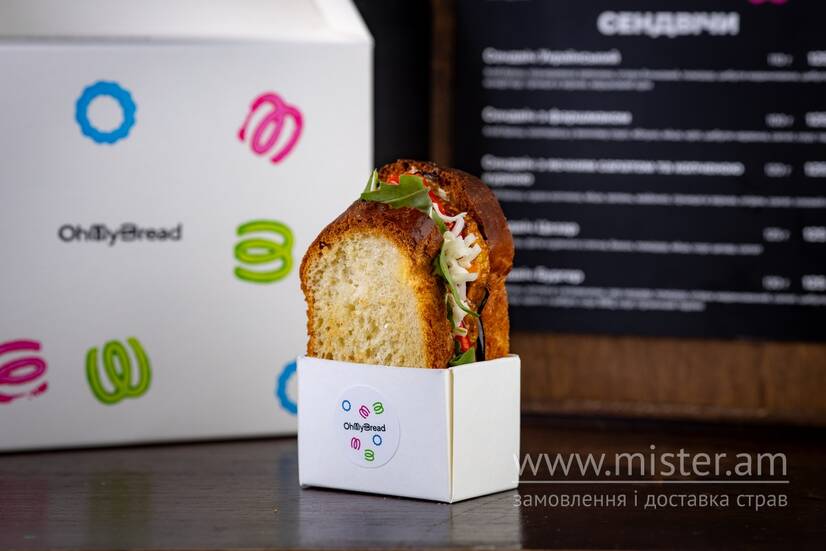 Хліб бріош, смажені на грилі баклажан та цукіні, перець печений, сир моцарела, рукола, грецький йогурт, соус песто, крем бальзамік.