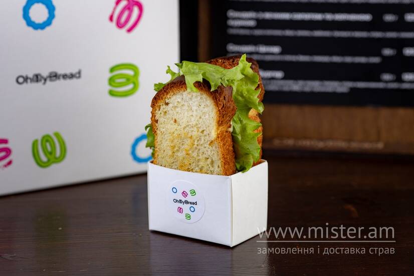 Хліб бріош, томлена яловичина, морква, цибуля, огірок бочковий, перець печений, салат, червона цибуля, майонез, соус хрін.