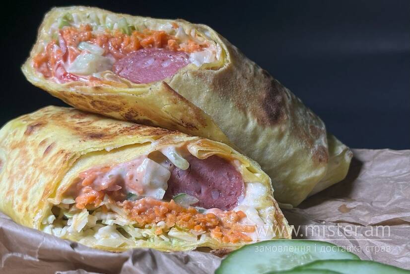 Копчена сосиска, пекінська капуста, морква по-корейськи, томат, огірок, соуси.