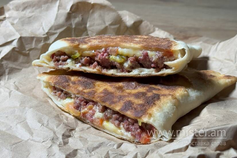 Телятина, томат, пікулі, сир, білий соус, BBQ соус.