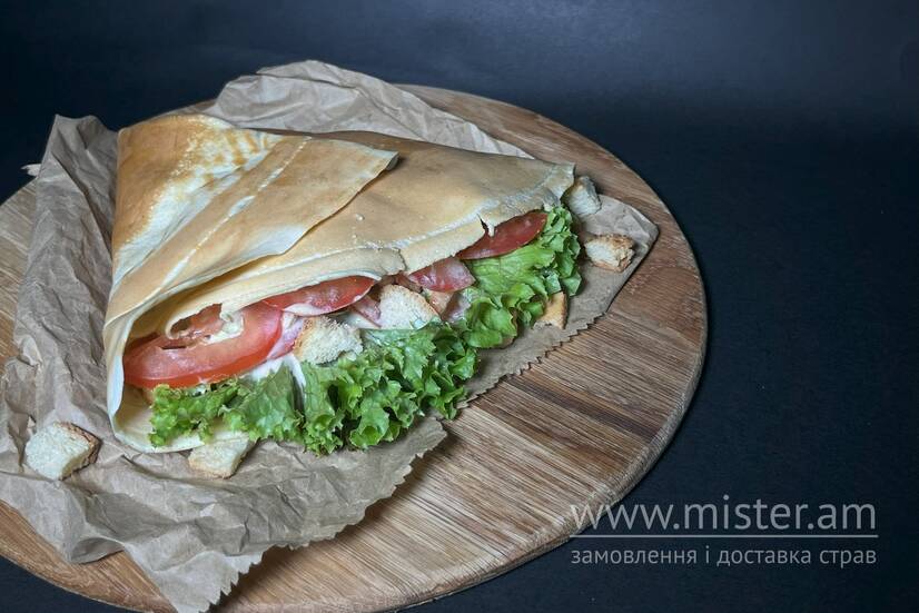 Курка, сир, капуста, томати, сухарі, медово-гірчичний соус.
