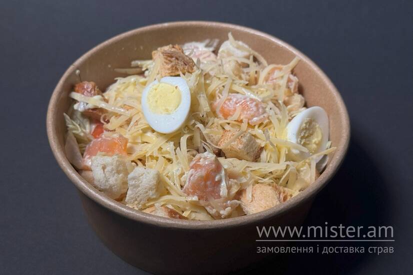 Лосось, салат айсберг, томат, сухарі, яйце перепелине, твердий сир, соус тартар.