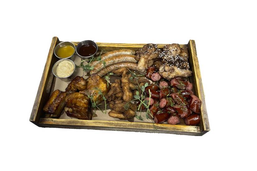 Стейк зі свинини, медові крильця, нагетси, поросячий вереск, мисливські ковбаски, соус медово-гірчичний, bbq, соус до мʼяса.