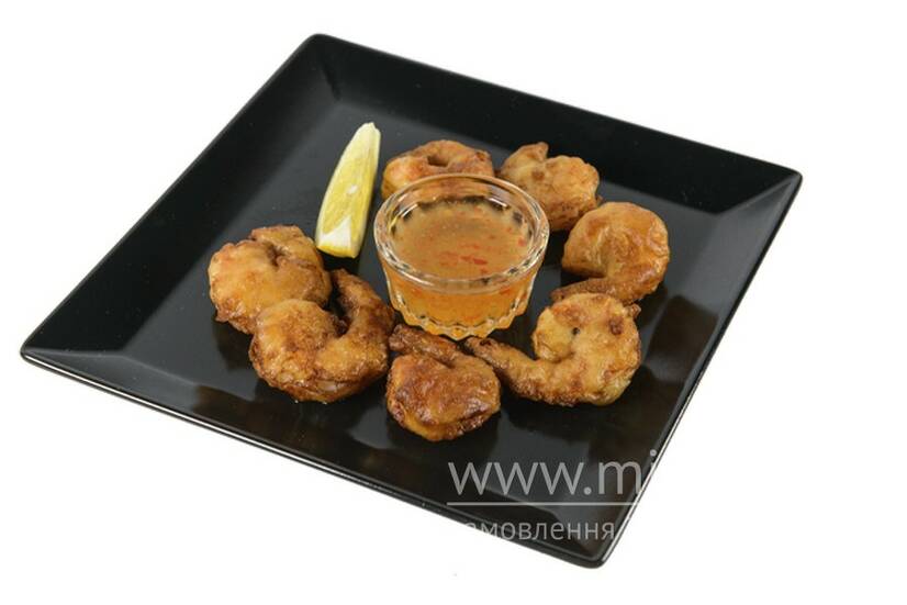 Тигрові креветки, темпура, соус солодкий чилі, лимон.