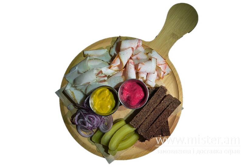 Сало, підчеревок, корнішони, гірчиця, хрін, хліб бородинський, цибуля.