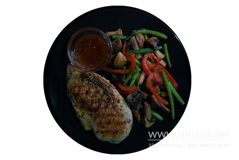 Філе куряче, печериці, болгарський перець, спаржа, соус медово-гірчичний.