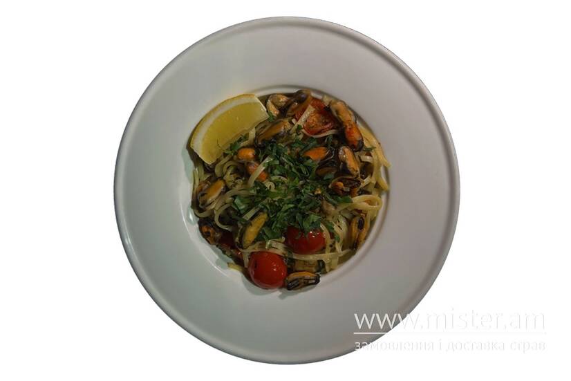Паста, мідії, помідори черрі, петрушка, часник. Паста в легкому винному соусі з часником та оливковою олією.