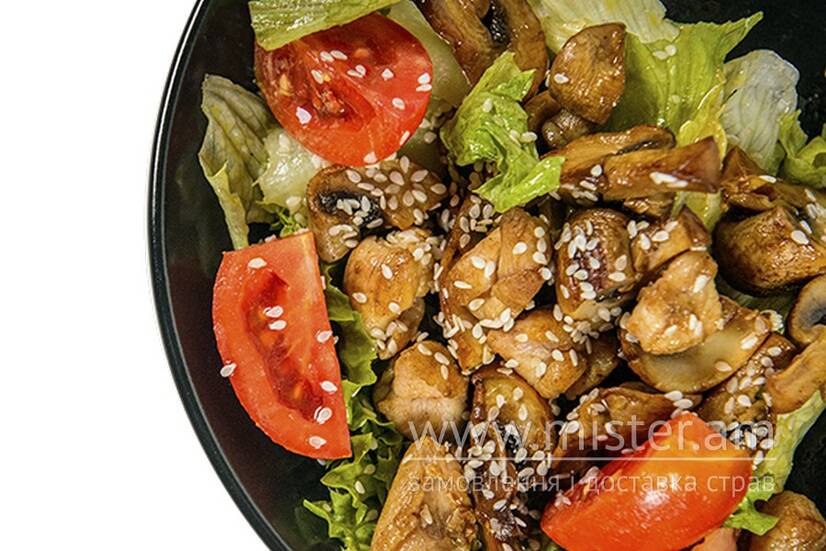 Куряче філе, печериці, помідор, лист салату, кунжут, заправка: медово-гірчична, соєвий соус.