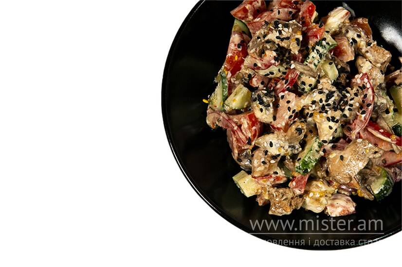 Куряче філе, печериці, огірок, болгарський перець, помідор, соєвий соус, майонез, гірчиця по-французьки, кунжут.