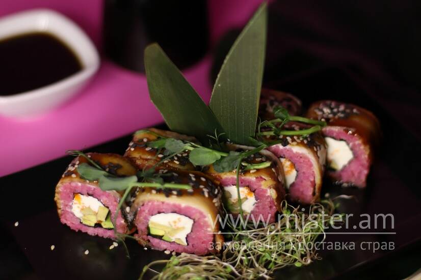 Норі, рис, крем-сир, авокадо, вугор, ікорний продукт, соус унагі, кунжут.