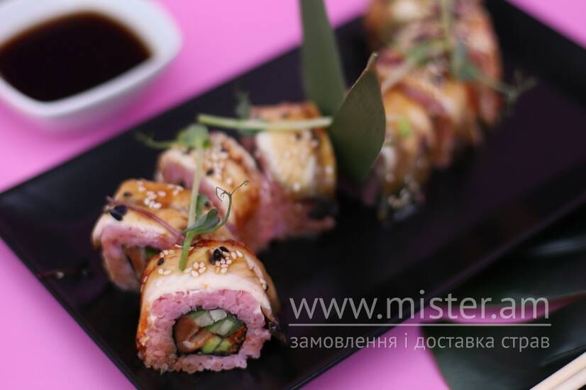 Норі, рис, вугор, лосось, ікорний продукт, огірок, авокадо, кунжут, соус Унагі.