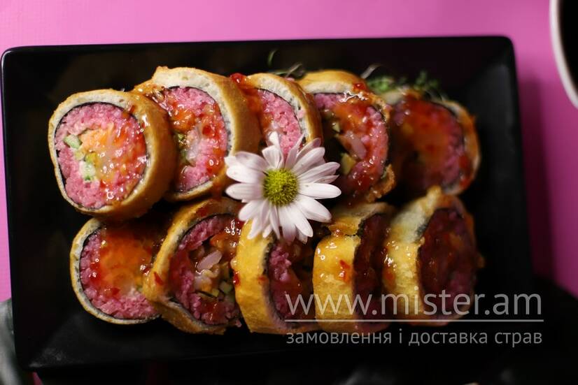 Рис, лосось, креветки, авокадо, огірок, темпура, норі, соус чилі солодкий, соус спайс.