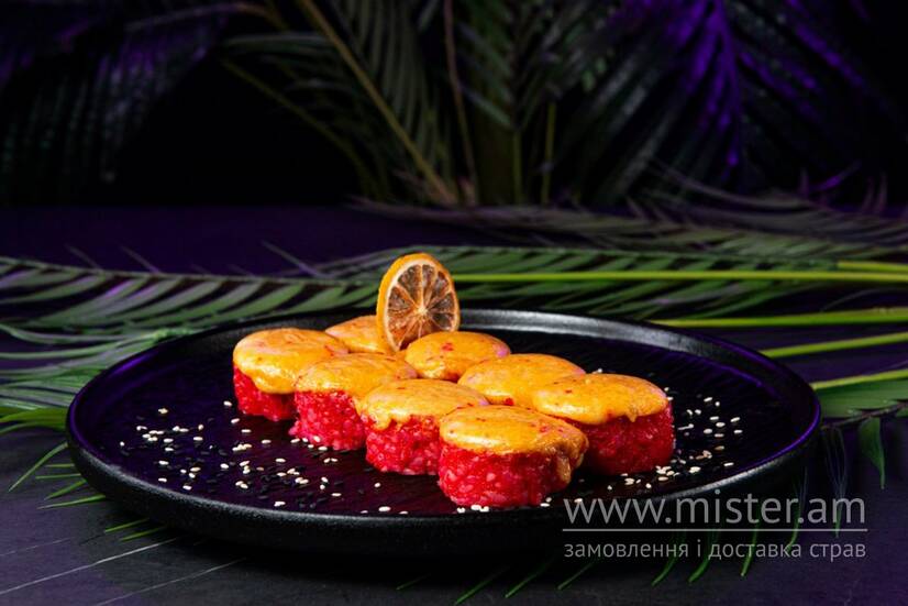 Рис, крем-сир, тигрова креветка, омлет, редька, ікра масаго, часник, шрірача, пармезан, японський майонез.
