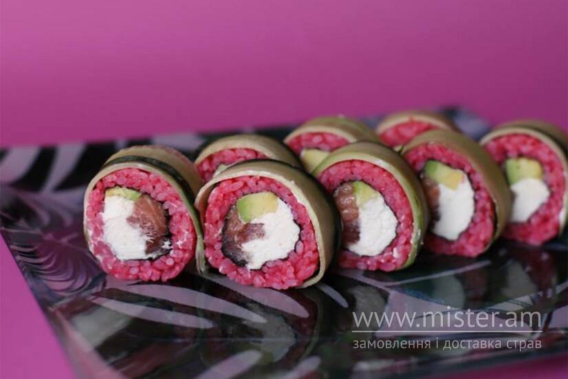 Норі, рис, огірок, крем-сир, лосось, тунець, авокадо, соус кімчі, ікра масага.