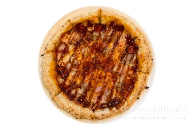 Томатний соус, сир моцарела, курка, салямі папероні, кабаноси, бекон, соус барбекю.