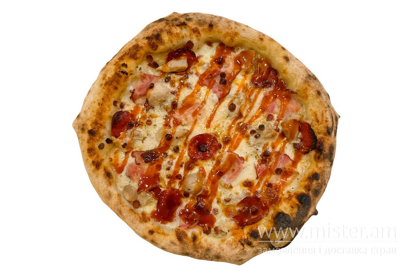 Соус вершковий, сир моцарела, курка, бекон, кабаноси, салямі, соус барбекю.
