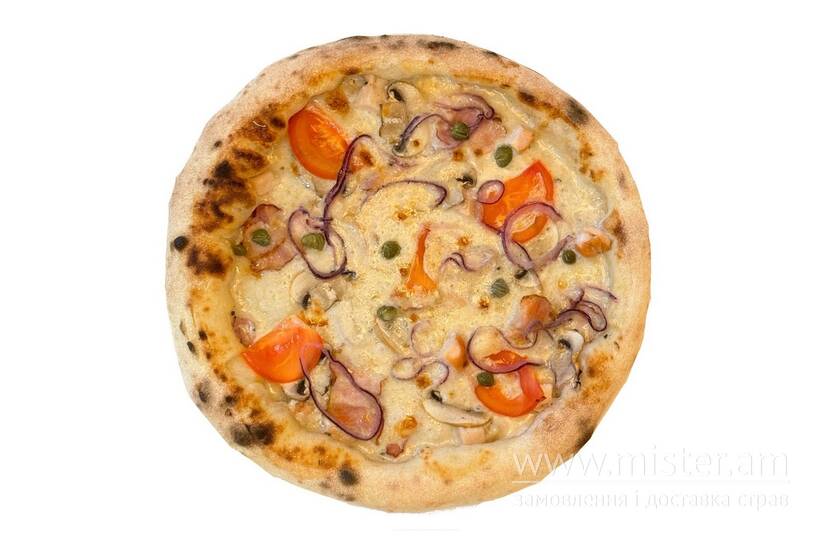 Вершковий соус, сир моцарела, печериці, помідор, куряче філе копчене, бекон копчений, цибуля маринована, каперси.