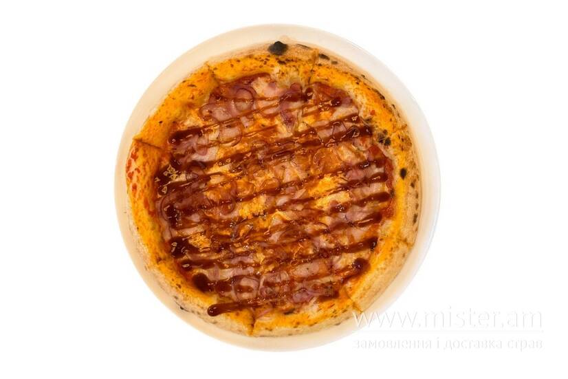 Томатний соус, сир моцарела, бекон копчений, цибуля маринована, соус барбекю.