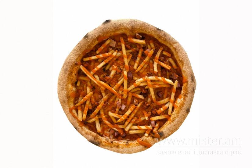 Томатний соус, сир моцарела, бекон копчений, картопля фрі.