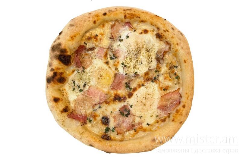 Вершковий соус, сир моцарела, бекон копчений, яйця курячі, сир пармезан, мікрогрін.