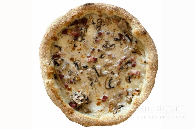 Вершковий соус, сир моцарела, куряче стегно, печериці, бекон копчений.