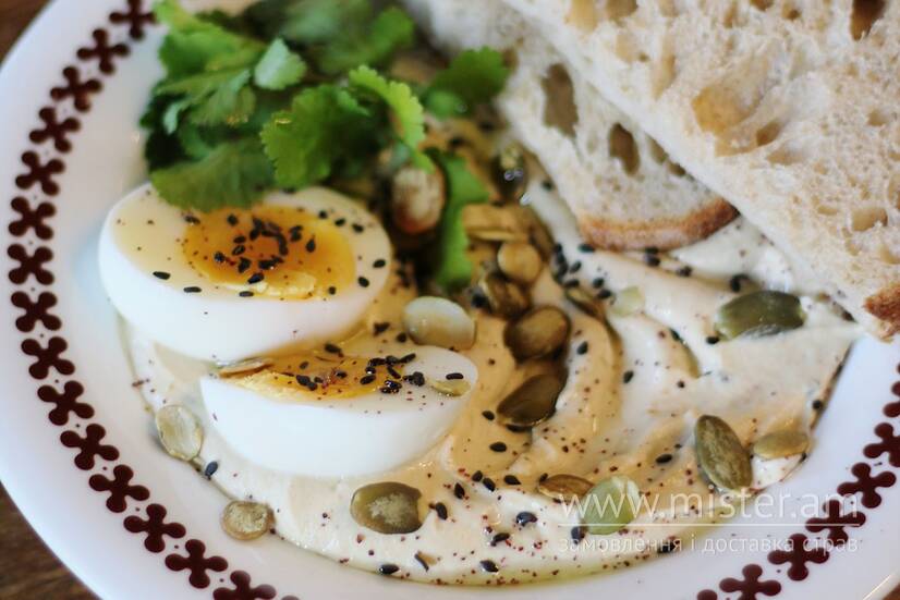 Ніжне пюре з нуту, яйце, кінза, насіння соняшника та смачненький хлібчик на заквасці.