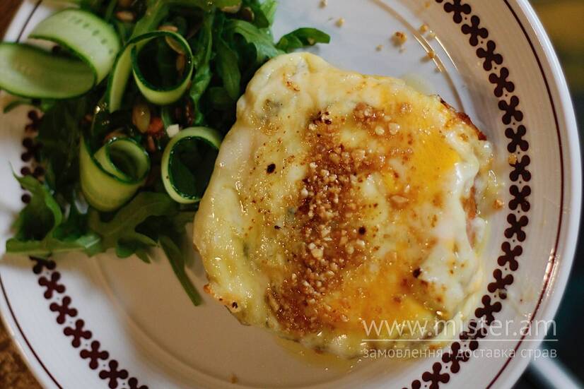 Бріош запечений із п'ятьма видами сиру, трюфельним медом та грушею, подається із зеленим салатом та сорго.
