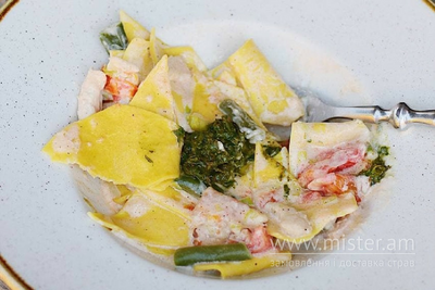 Курячий бульйон + мальтальяті з куркою, беконом та соусом песто