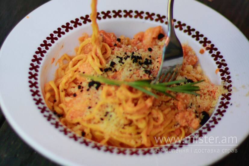 Домашні спагеті з креветкою та крихтою бекону