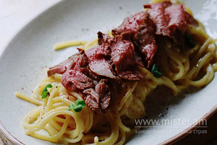Спагеті Качіо-е-пепе з маринованою телятиною