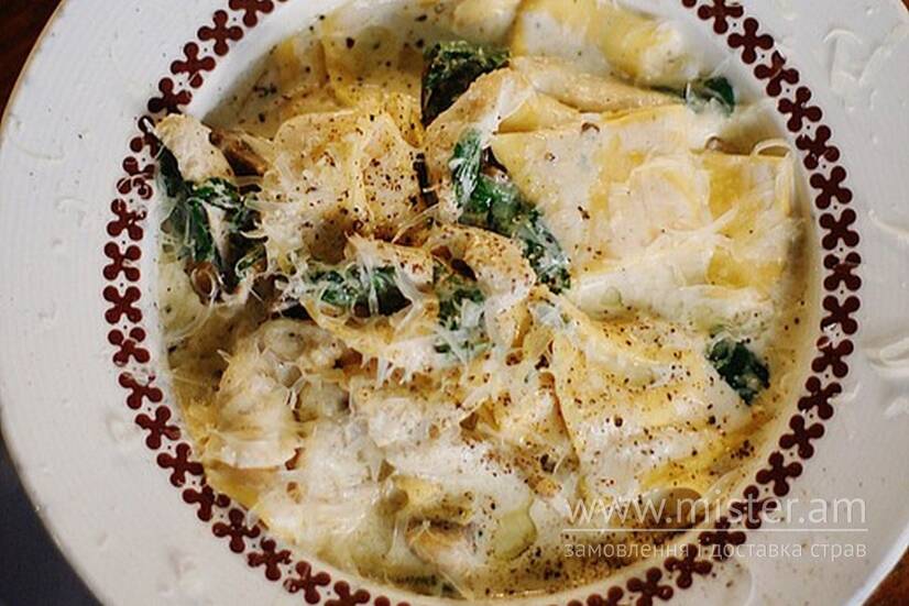 Папарделе у подвійному вершковому соусі з куркою та грибами